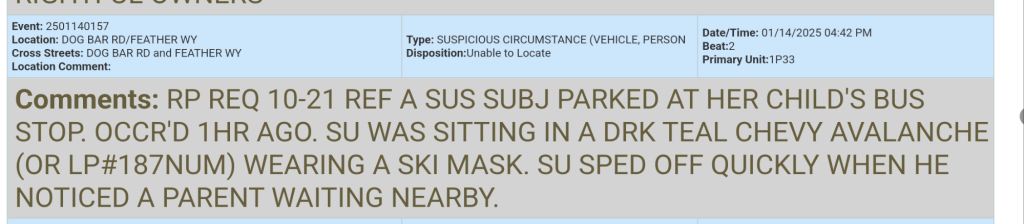 A resident reported a suspicious subject parked at her child’s bus stop an hour prior. The individual, sitting in a dark teal Chevy Avalanche and wearing a ski mask, quickly sped off when he noticed a parent nearby. The resident’s vigilance serves as a reminder to always stay aware of unusual behavior, especially in areas frequented by children.