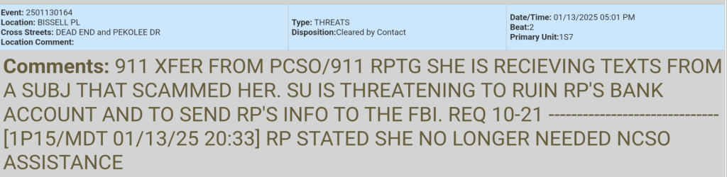 Another caller reached out after being contacted by a person who had scammed her previously who now was sending her threatening texts. The scammer claimed they would ruin her bank account and report her to the FBI. The reporting party originally sought police advice on how to handle this modern-day con artist but in the end, stated she no longer would need their help.