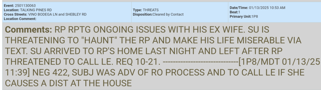 A resident reported ongoing issues with his ex-wife, who has allegedly been threatening him via text messages. Her latest tactic? Claiming she’ll “haunt” him and make his life miserable. While it’s unclear whether this haunting involves ghostly antics or just persistent texting, it’s safe to say this isn’t your typical small-town dispute.