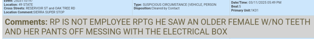 A witness reported an older woman — teeth and pants missing — messing around with the electrical box in the area of the Sierra Super Stop in North San Juan. She may have just been an elderly electrician making a fashion statement but regardless, this one definitely left locals buzzing.