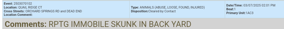 An immobile skunk was reported in a backyard, leaving the caller in a real stink. Was it playing dead, deep in thought, or simply waiting for a dramatic rescue by animal control? We may never know.