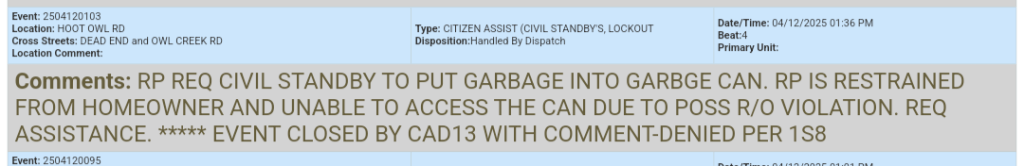A caller requested a civil standby so they could legally place their garbage in a trash can — a task complicated by an active restraining order against the homeowner. Sometimes even simple chores can get tangled in legal knots.