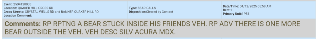 The caller reported a bear stuck inside a friend’s vehicle, and to add to the wild tale, mentioned an additional bear loitering outside.