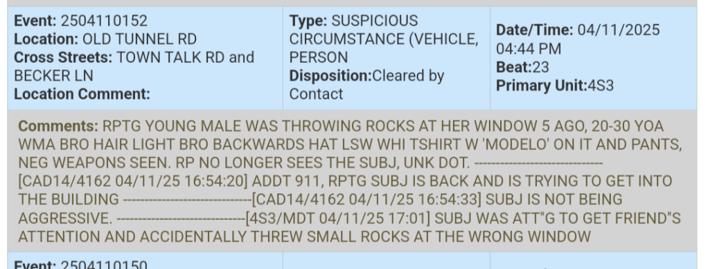 A young male was seen tossing rocks at a window, prompting concern. Turns out, he was just trying to get a friend’s attention and accidentally chose the wrong window. No aggression involved, just poor aim and even poorer timing.