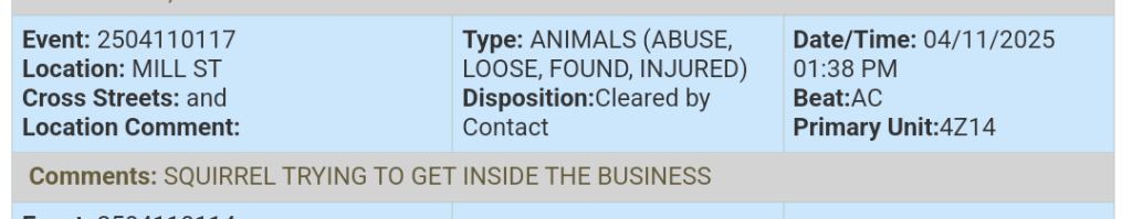 A report came in about a determined squirrel attempting to enter a business on Mill Street.