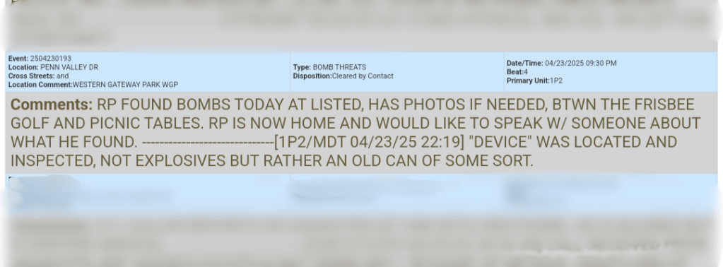 Caller believed they found bombs near the disc golf course at Western Gateway Park, but after inspection, it turned out just to be an old can.