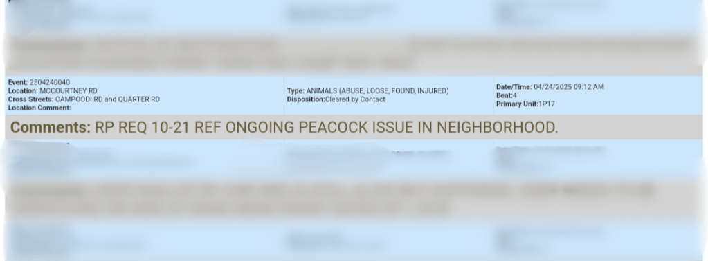 Caller requested a phone consult regarding an “ongoing peacock issue” terrorizing the neighborhood.