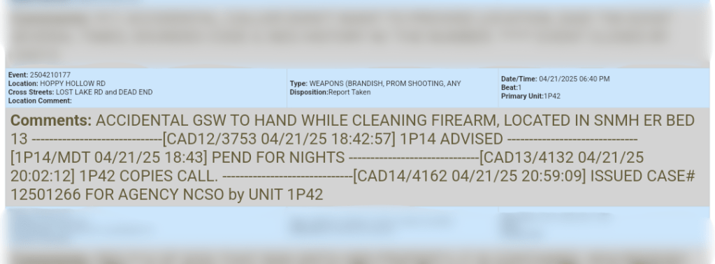A caller reported an accidental gunshot wound to the hand while cleaning a firearm.