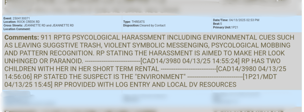 A caller reported environmental harassment involving trash, secret violent symbolism, and ominous vibes meant to make her seem unstable. Suspect identified: “The Environment.”