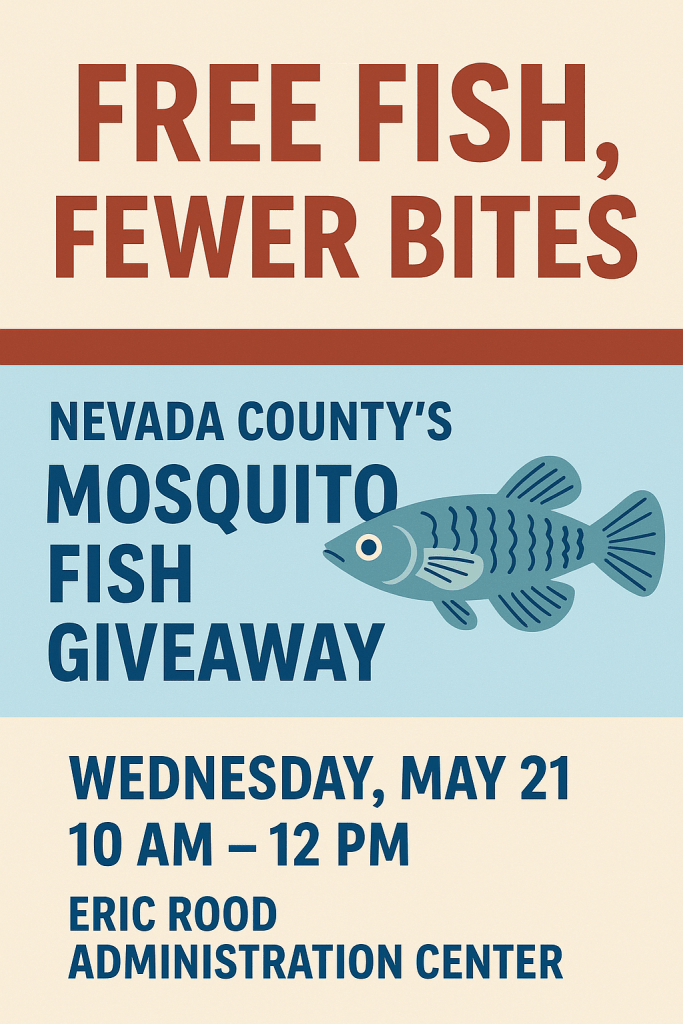 On Wednesday, May 21st from 10AM to noon, Nevada County is hosting a free Mosquito Fish Giveaway at the Eric Rood Administrative Center (that’s 950 Maidu Avenue in Nevada City, for my fellow directionally challenged folks).