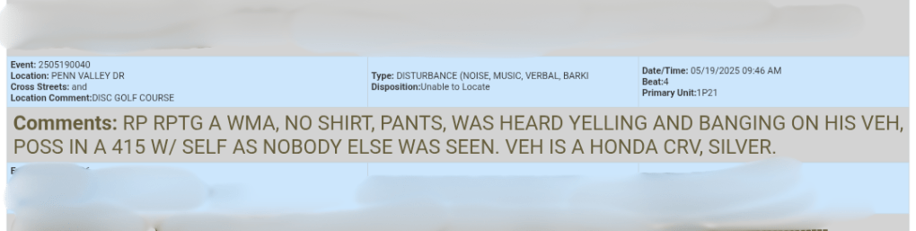 All calls were obtained from the Nevada County Sheriff’s Office call logs and are considered public records. Please note that any additional commentary reflects the author’s perspective and does not represent the views of the Nevada County Sheriff’s Office or its affiliates. This commentary aims to provide a lighthearted take on otherwise challenging situations and is not intended to harm, slander, or negatively impact anyone involved.