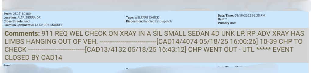A concerned caller requested a welfare check on a woman spotted in a small silver sedan—with limbs hanging out the window.