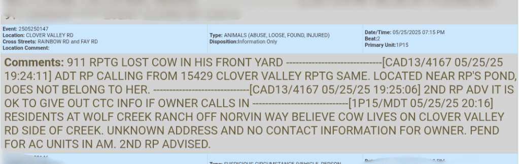If this week’s calls taught us anything, it’s that reality is weirder than fiction—especially in Nevada County. Whether it’s peacocks on parade, cows on vacation, or attic church services, there’s never a dull moment in this neck of the woods.