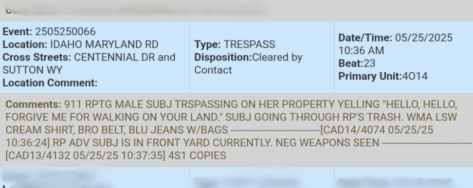 A man shouting hello then apologized for trespassing. He was digging through the caller’s garbage when speaking to dispatch. Cream shirt, brown belt, blue jeans, and possibly looking for life’s answers in yesterday’s leftovers.