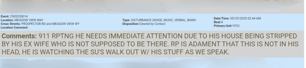 A very distressed man reports his ex-wife is removing items from his home right now, and he’s adamant this is not a delusion.