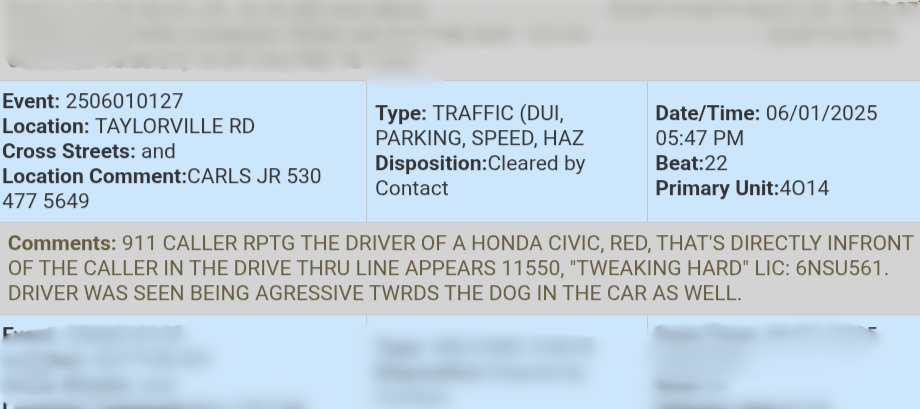 A 911 call came in from someone in the Carl’s Jr. drive-thru who reported that the driver of the red Honda Civic in front of them was “tweaking hard” and behaving aggressively toward the dog inside the car.