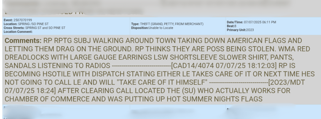 A caller reports a suspicious person taking down American flags and letting them drag on the ground. Gets increasingly hostile, threatening to “take care of it himself” next time. Turns out the man works for the Chamber of Commerce and was setting up for Hot Summer Nights.