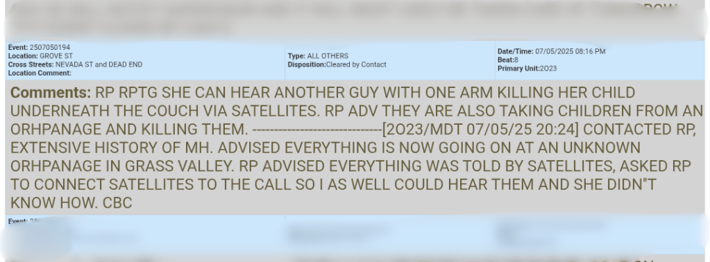 A woman reports hearing a man with one arm killing her child underneath the couch—via satellites. She also believes children are being taken from a Grass Valley orphanage. When asked to connect the satellites so dispatch could hear, she wasn’t sure how.