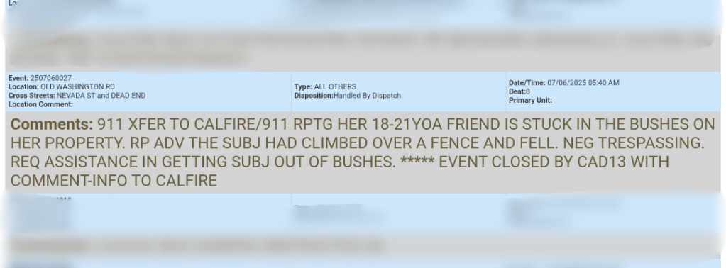 All content in Call Log Diaries is based on publicly available Nevada County dispatch logs. Personal details, names, and addresses have been omitted or altered to protect privacy. These summaries are for entertainment only. Real people, real calls—just with a sprinkle of sarcasm and small-town sparkle.