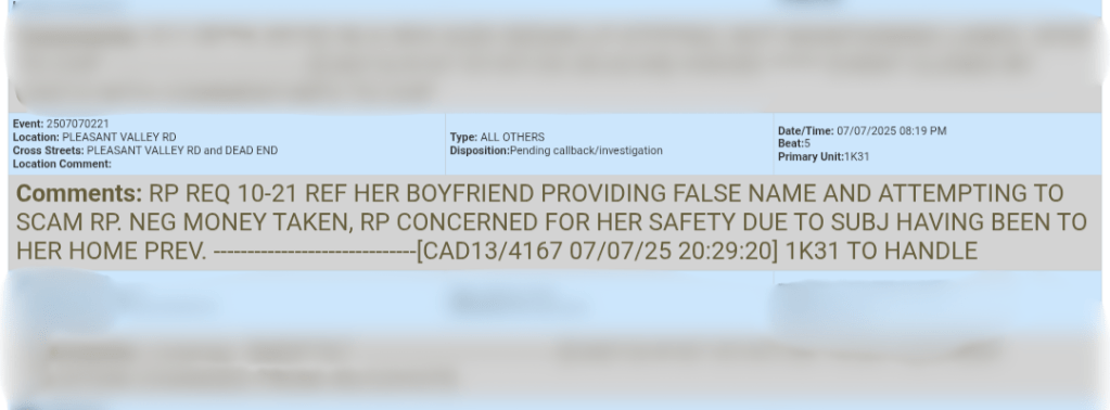 A woman called in regarding her boyfriend allegedly giving her a fake name and attempting to scam her. No money was taken, but she’s now concerned for her safety since he’s been to her home before.