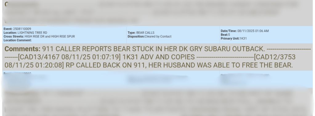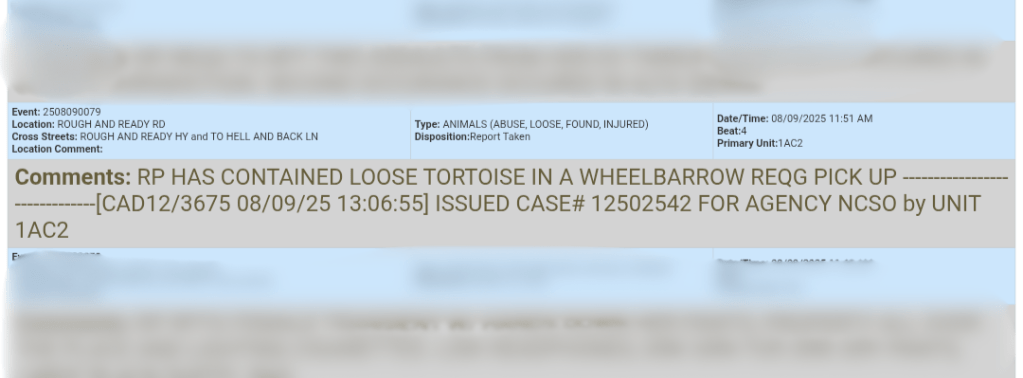 And there you have it—tortoises on the move, bears breaking into Subarus, and saxophone solos turning into potential SWAT situations. Nevada County continues to be the magical, slightly feral place where every week feels like an episode of Parks and Rec, but with more wild animals and fewer permits. If you’ve ever wondered what small-town life really looks like, look no further than the Call Log Diaries.