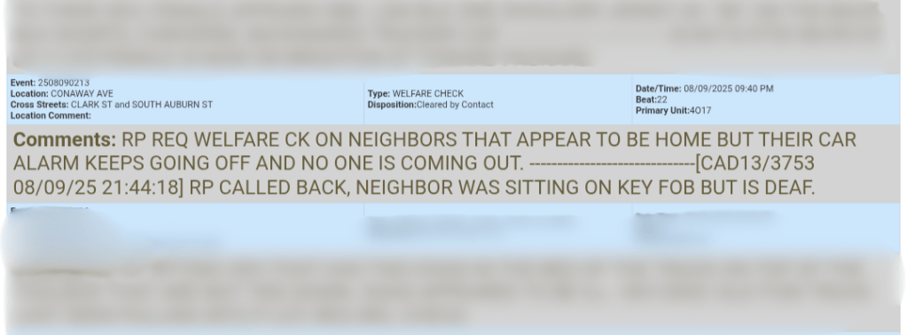 A concerned neighbor called in to report a car alarm going off repeatedly with no response from the homeowners—who appeared to be home. Turns out, the neighbor was sitting on the key fob the whole time… and is deaf.