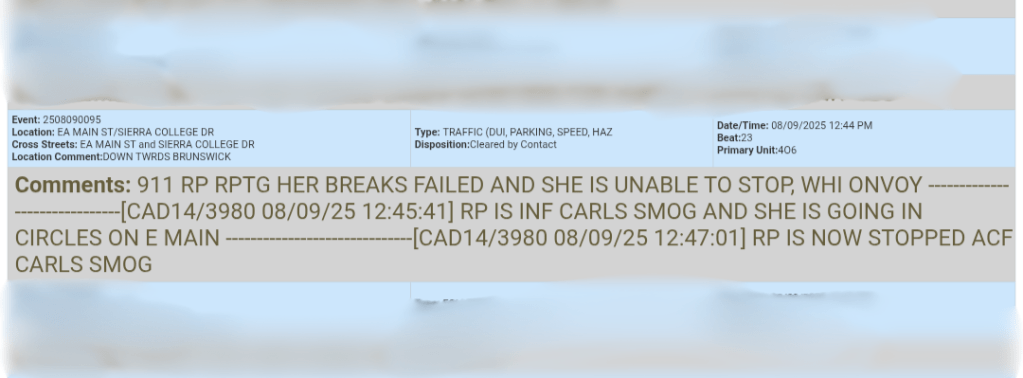 A woman called 911 because her brakes failed, and she couldn’t stop—so she did what anyone would do in a panic: she kept circling around the roundabout on East Main until coming to a stop in front of Carl’s Smog.