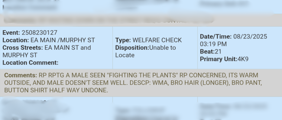A caller reported a man aggressively “fighting the plants” in broad daylight. It was hot out, and the man didn’t seem well, wearing long brown pants and a half-buttoned shirt.