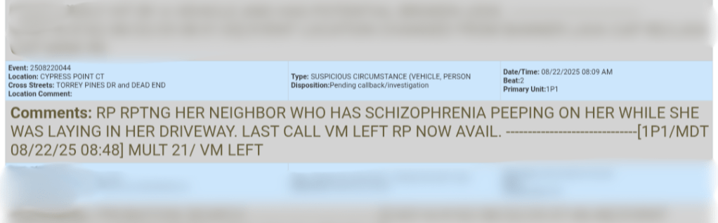 A woman reported her neighbor—who has schizophrenia—was peeping on her while she was laying in her driveway.
