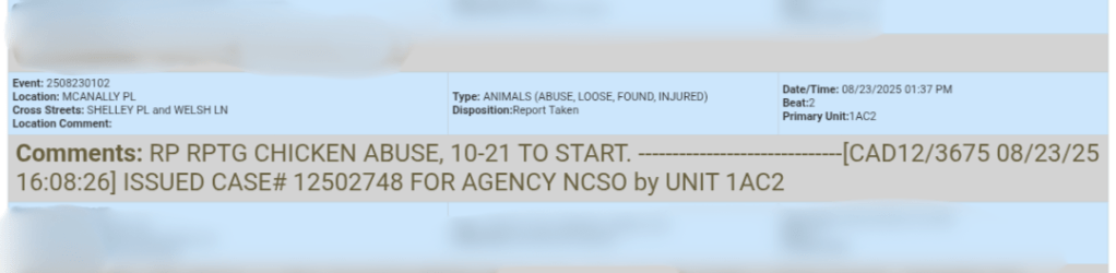 Someone called in to report chicken abuse.