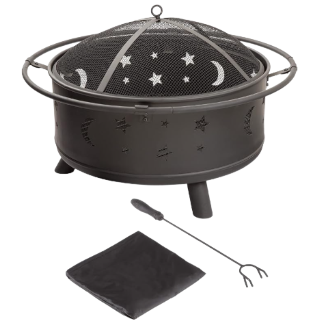 A sturdy steel firepit with a mesh spark screen and fire poker, making it safe and easy to enjoy those crisp autumn evenings.
