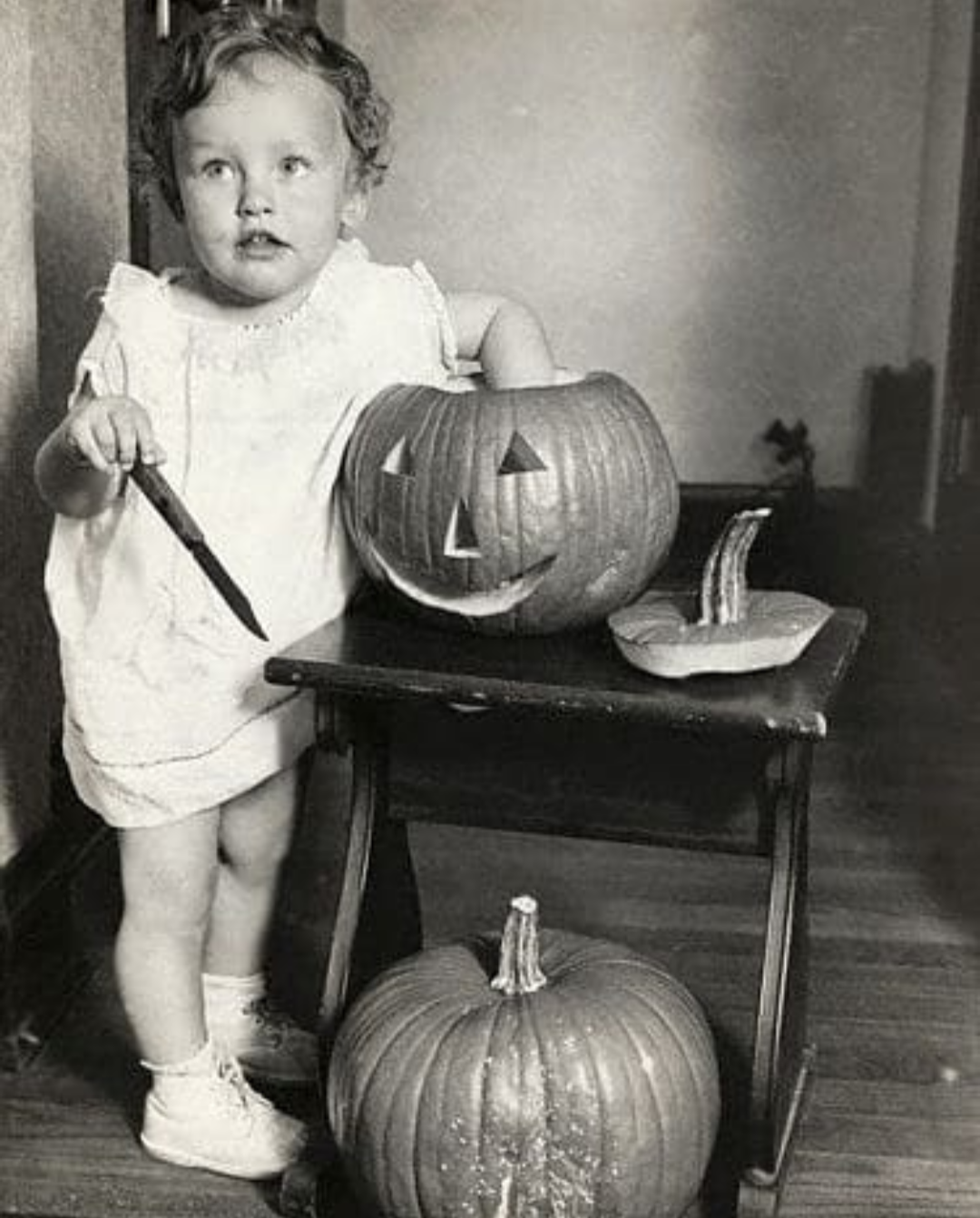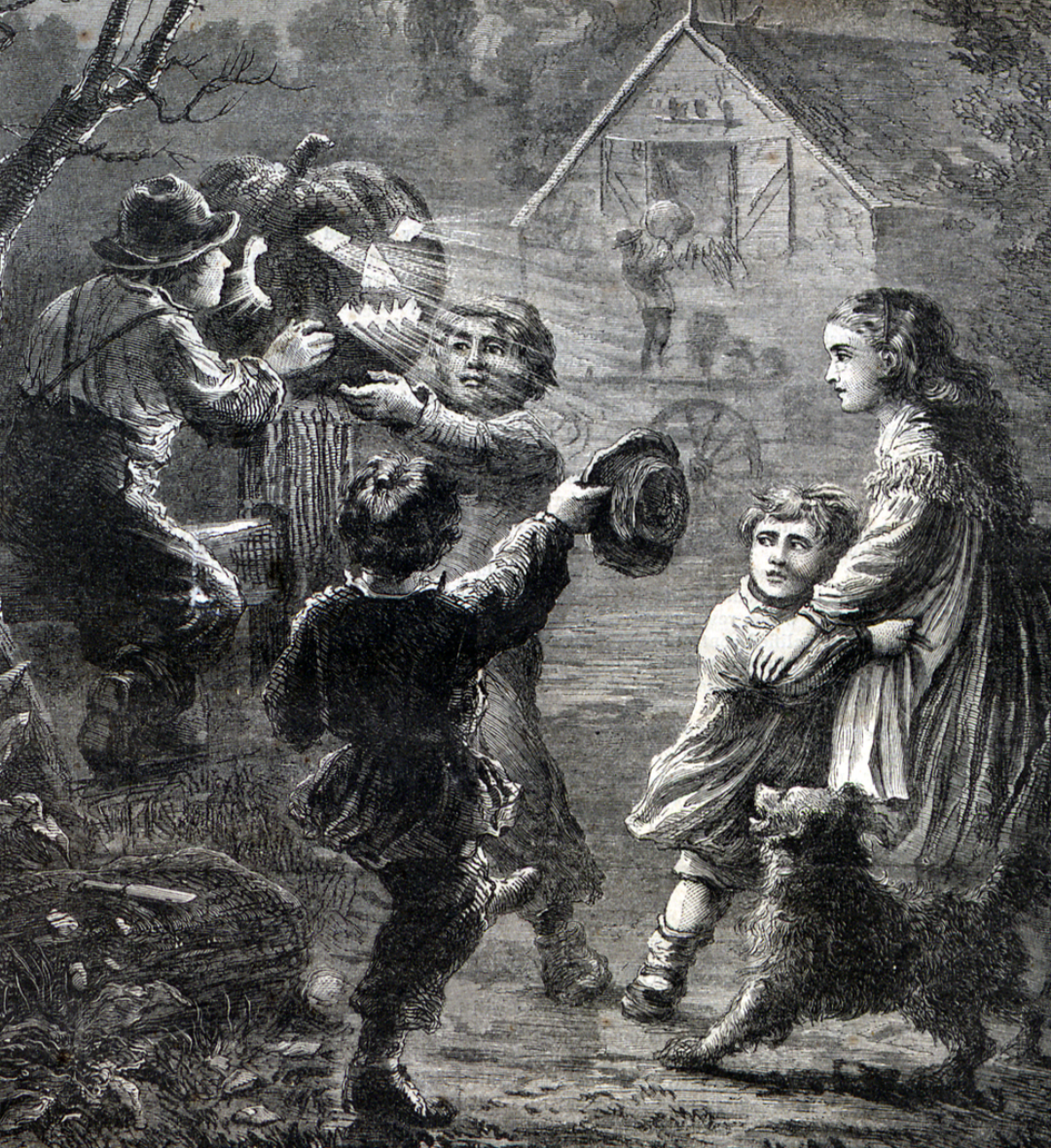 And an 1867 illustration in Harper’s Weekly titled “A Pumpkin Effigy” shows carved gourds, even if not yet full Halloween-festooned.