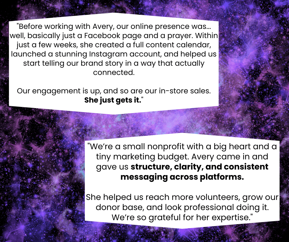 Whether you just need a few captions, a one-time strategy session, or help polishing up your campaign, I’m happy to tailor services to fit exactly what you need—nothing more, nothing less. Just reach out and let’s build something that works for you.